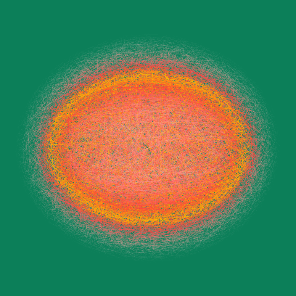 I first considered an imaginary ellipse on the canvas and its path defined by its fixed combined distance from two foci. I then threw thousands of random points onto the canvas and calculated their combined distances from the two foci. The amount that each distance differed from that of the ellipse was used to vary the colour and thickness of the line.