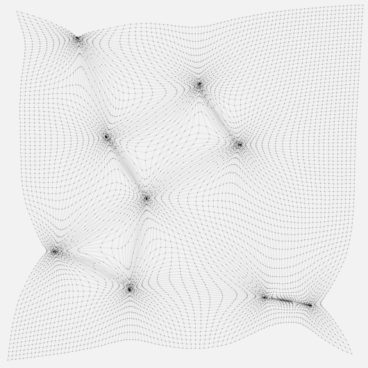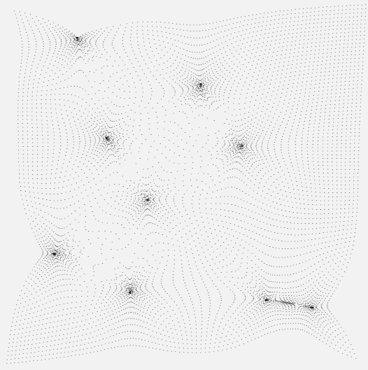 My birds are very simple. I lined them up in a regular grid then placed a bunch of fixed invisible “magnets” randomly on the screen. The birds are attracted to every magnet in equal measure which causes them to accelerate and move. The birds make no attempt to keep away from each other. I also modelled a bit of drag slowing the birds down as though there were air friction.